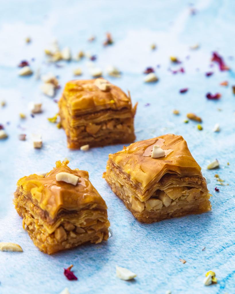 Immerse yourself in the rich, buttery taste of premium cashews, intricately layered within our delicate, flaky filo pastry. Each layer of filo is meticulously handcrafted to achieve the ideal balance of lightness and crispness. As you indulge, the velvety smoothness of the cashews intertwines with the buttery pastry, creating a symphony of indulgent flavours and luxurious textures that captivate your senses. To enhance this culinary marvel, our Cashew Baklava is delicately drizzled with a honey syrup and aromatic syrup, adding a touch of sweetness that perfectly complements the nutty richness. Topped with a sprinkle of finely ground cashew powder, every bite is a celebration of gourmet delight.
